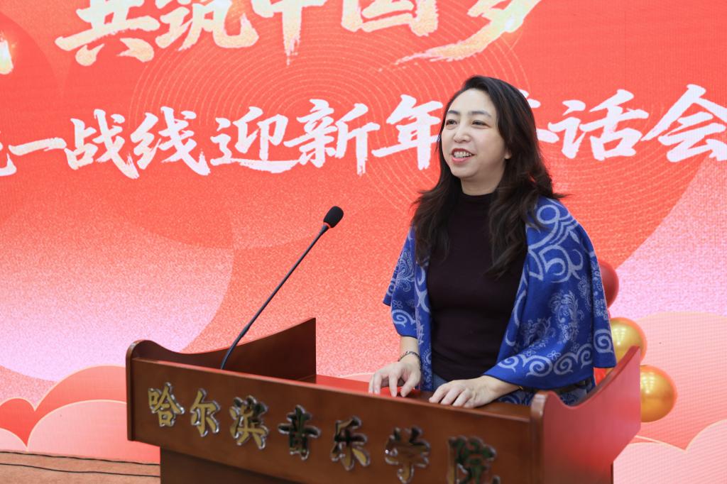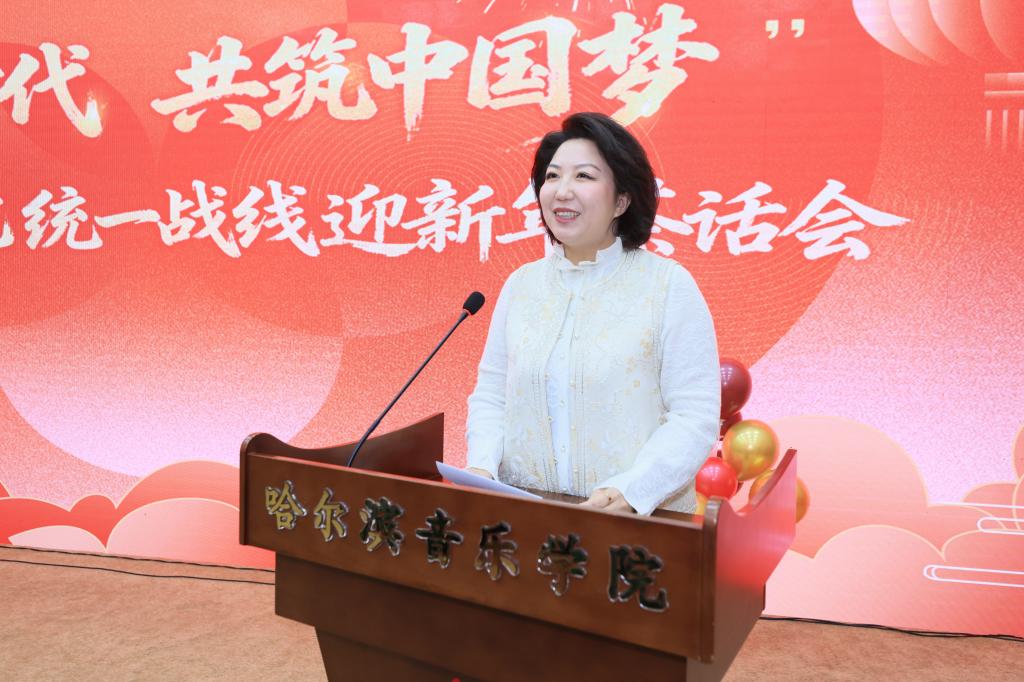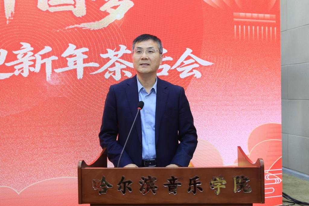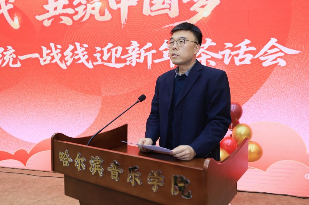 学院党委书记雒文虎在讲话中代表学院党委向全体统战成员致以新年祝福。他回顾了2025年学院统战工作取得的显著成绩:在思想引领方面,持续深化统战政策理论学习,加强党外干部培养使用;在民族团结方面,成功获批“黑龙江省高校铸牢中华民族共同体意识教育实践基地”,多项活动得到国家民委肯定;在服务发展方面,统战成员围绕龙江振兴深入调研献策,推动学院与省市部门建立常态化对接机制,为“音乐之城”建设贡献智慧力量。